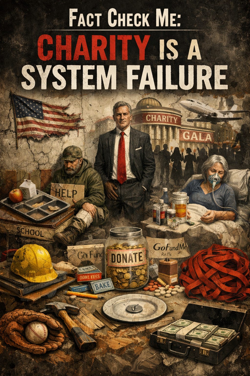 Charity is treated like virtue, but most of the time it’s just a confession of systemic failure. It’s the applause at the end of a bad play — everyone clapping so we don’t have to admit the whole thing was broken.