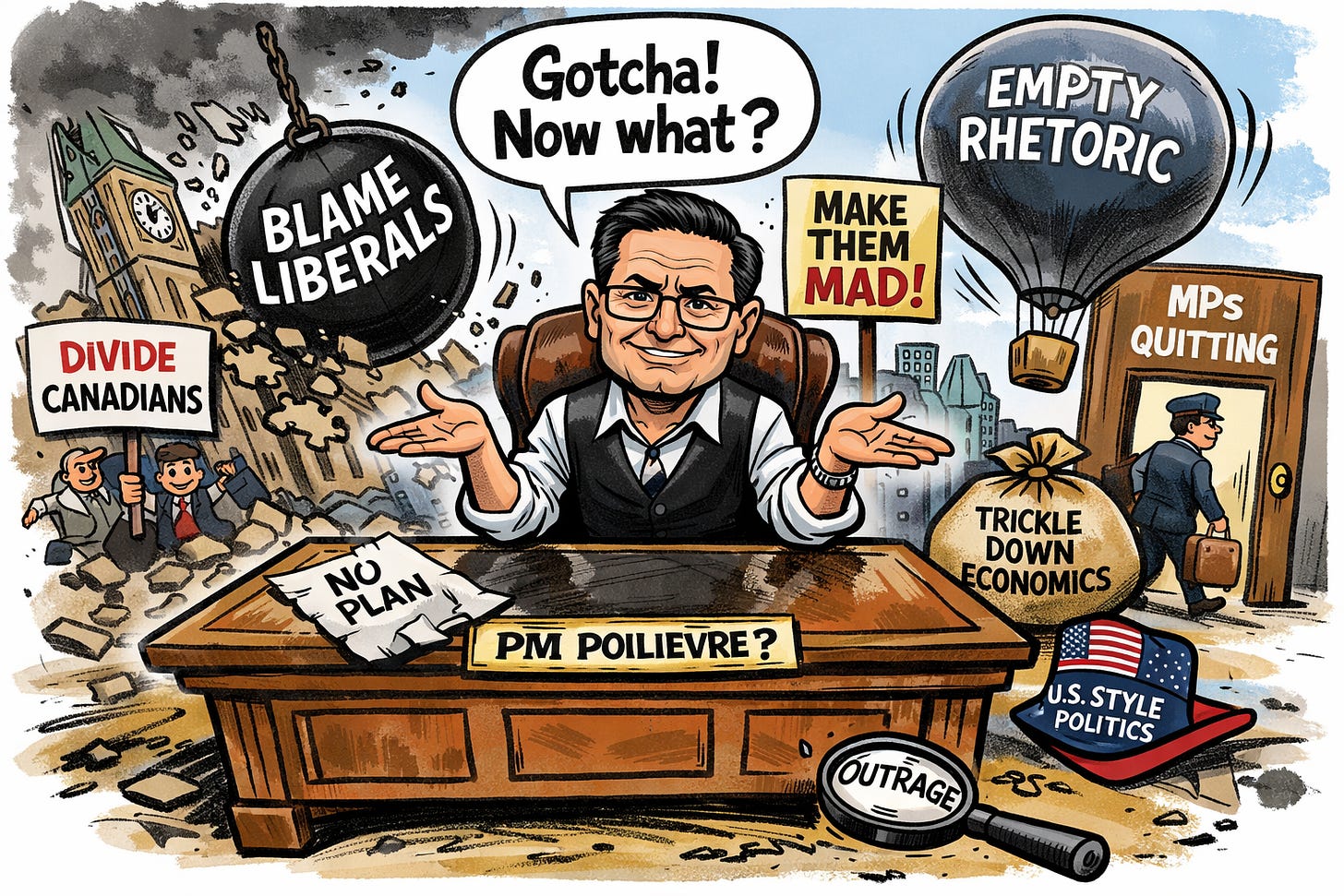 Canada is dealing with affordability crises, housing shortages, strained healthcare systems, infrastructure gaps, climate pressures, and growing distrust in institutions. These aren’t solved by sarcasm. They aren’t solved by calling your opponents incompetent every day for four years.