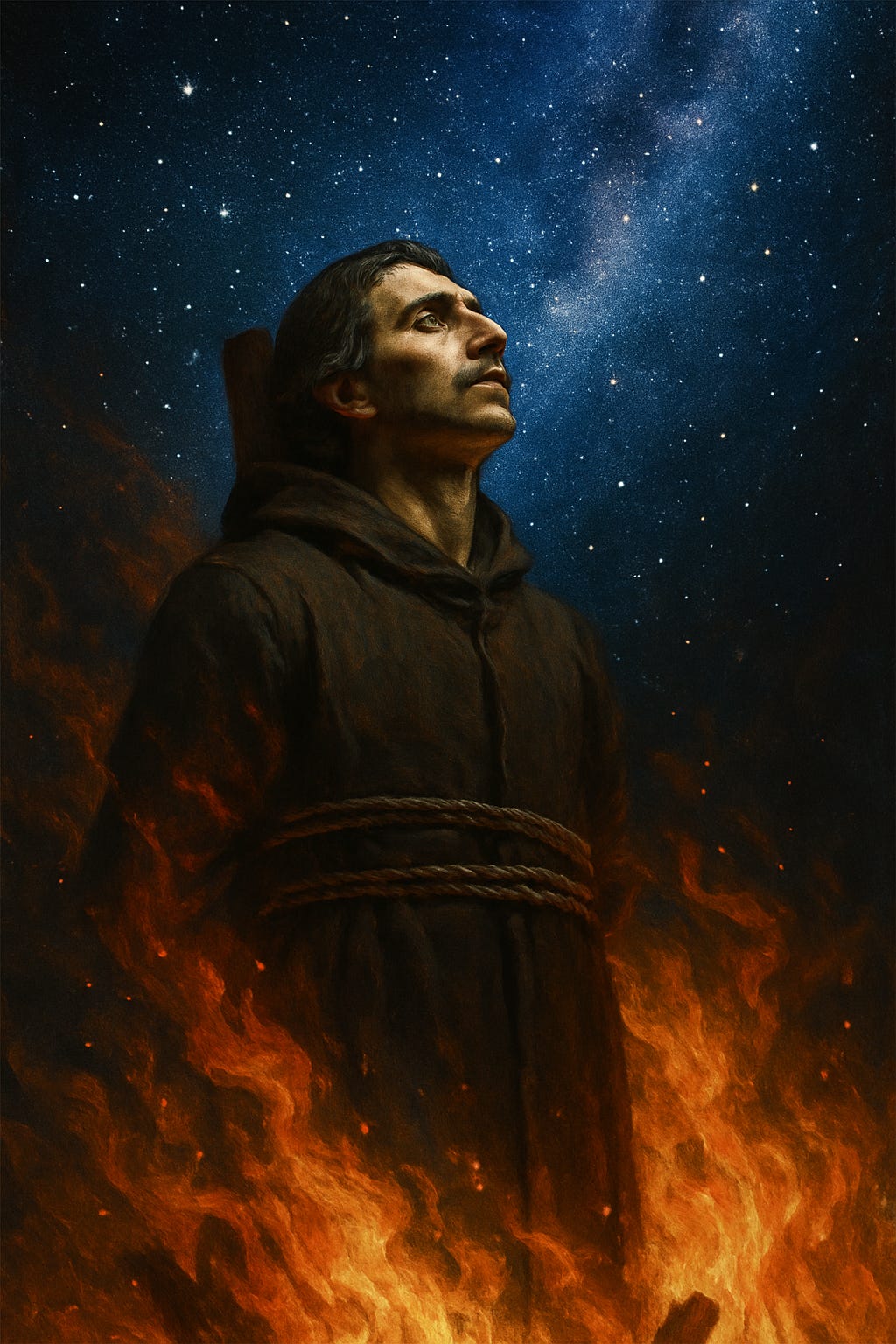 Hundreds of years ago there was a monk — *Giordano Bruno.* A friar. A believer. A man of God. He did everything right, said all the prayers, followed all the rules… until he started doing the one thing religion has always been terrified of: